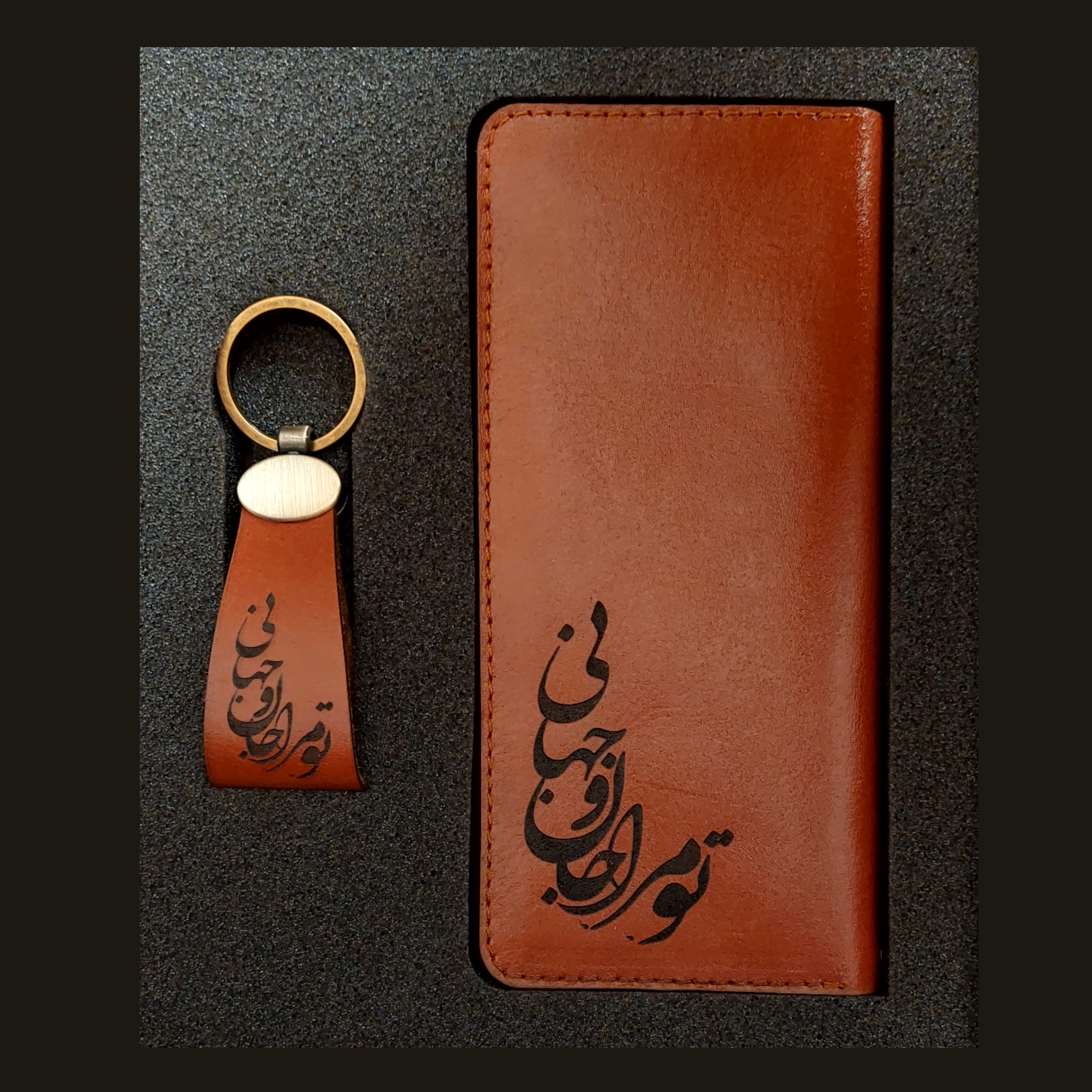 کیف پول چرمی جان وجهان تهیه شده از چرم طبیعی گاوی است این کیف پول باابعاد19.5×10 دارای جای کارت جای موبایل و جای اسکناس میباشد همچنین این کیف پول دارای بند دستی برای امنیت بیشتر هنگام استفاده میباشد این ست دارای یک عدد جاسوییچی چرمیست حک شعر بر روی چرم این ست زیبا رو به هدیه ای زیبا وخاص وماندگار برای تقدیم به عزیزانتان تبدیل کرده گروه تولید محصول امیدوار است بهترین خاطره ها با خرید این ست زیبا برای شما رقم بخورد